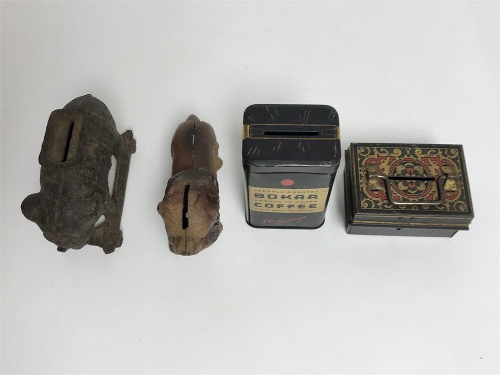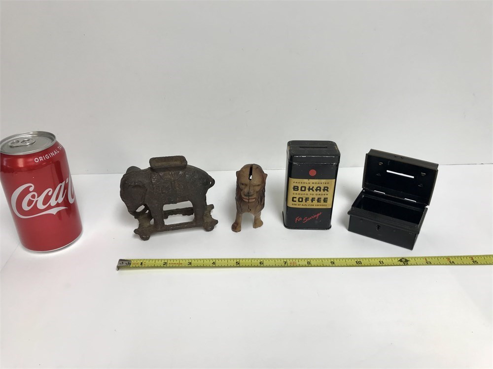 Bokar Coffee tin bank.  Cast iron elephant has no wheels.  Good condition painted cast iron lion.  Small English box bank.