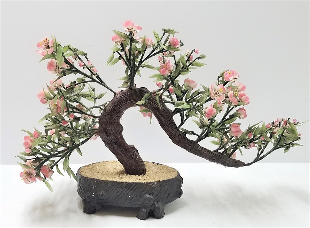 Wire tree with glass leaves and glass (or possibly acrylic?) petals.  A pretty flowering tree branch.  Plastic type trunk and planter.