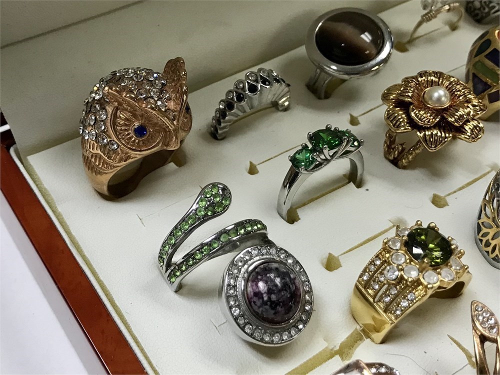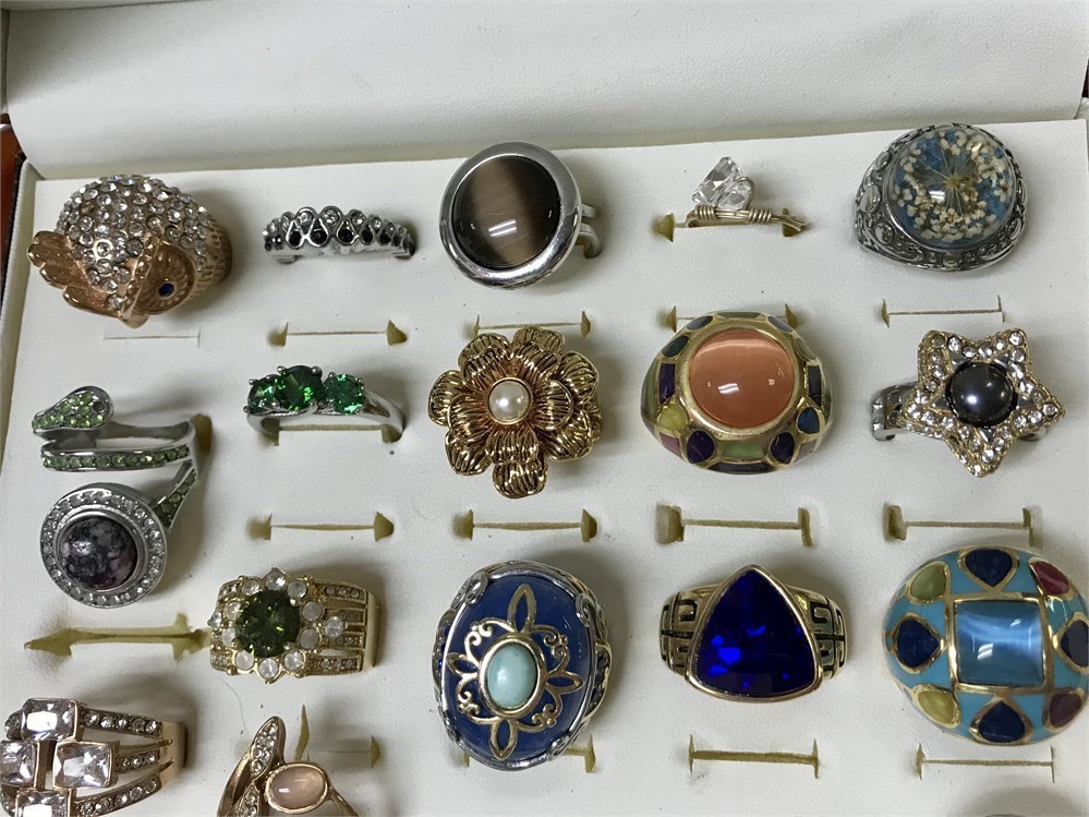 Ring wardrobe from a single estate.  Costume jewelry including some stainless steel.  Some older but several like new.  All kinds of interesting designs!  Display box included too.