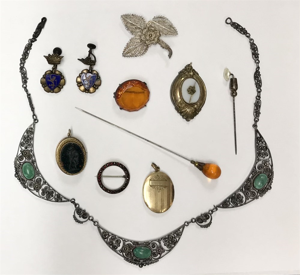 Great group!  Includes a filigree necklace, cannetille pin, crown/crest earrings, stickpin, hat pin, a nice garnet circle pin, and more.  Also notice the old bloodstone cameo pendant, with an intaglio of Hercules fighting a lion.  Everything as pictured, some with flaws, estate group.