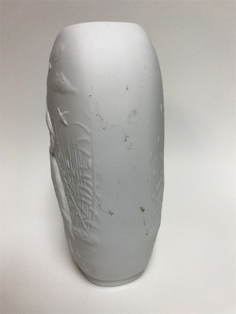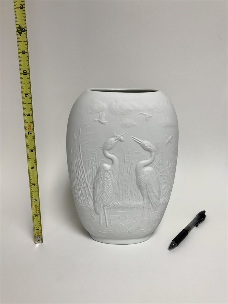 Bisque white vase with a scene of fishing egrets/herons/birds.  About 9" tall.  No chips or cracks; some stray marks on one side.  By Royal Porcelain, Bavaria KPM, Germany, see pic.