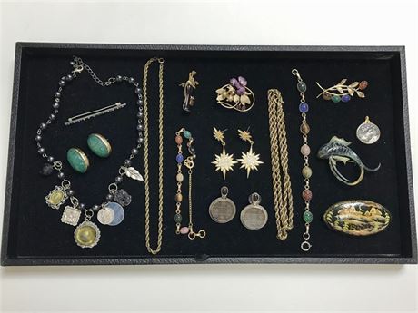 Assortment includes gold-filled necklaces, Winard GF scarab/flower pin, other scarab jewelry, coin pendant and earrings.  Alice Caviness GF earrings.  The bar pin is sterling, missing a stone.  Also a fish pin and a Russian painted wood pin.