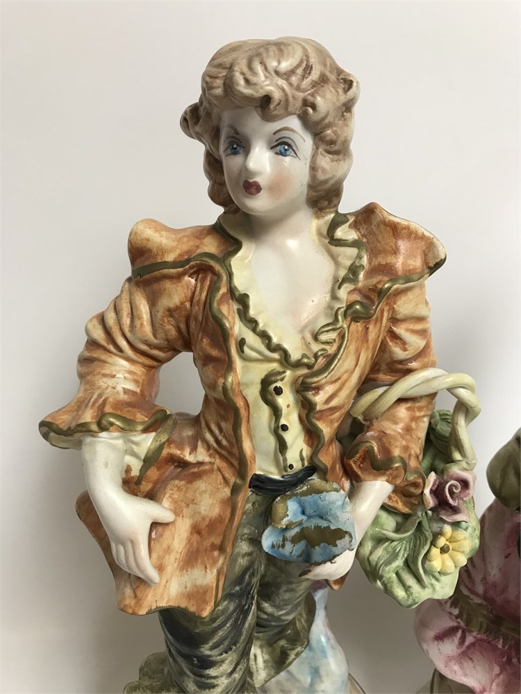 Capodimonte couple, each marked Made in Italy and Capo-di-monte with crown.  The gent's basket handle is reglued, otherwise good general condition.