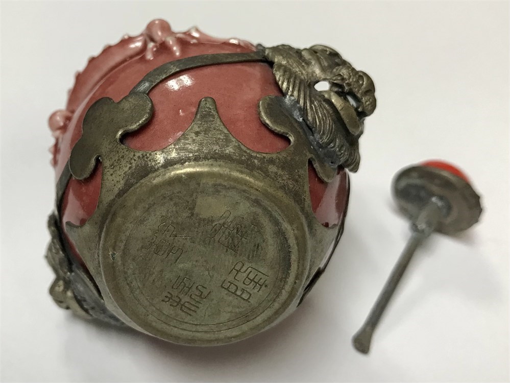 And a ceramic snuff bottle with fancy metal fittings and a spoon stopper.  The animal has a little chip on its head, hard to notice, otherwise good condition.  Marked on the bottom.