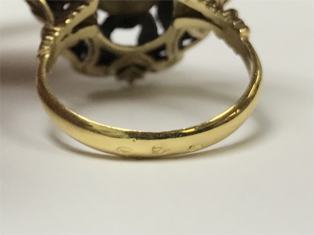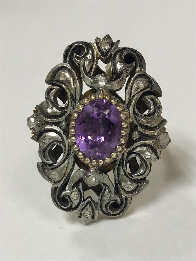 Vintage amethyst ring with diamond chips.  It is hallmarked illegibly on the outside of the band, and the gold part tests as 14K.  The fancy gold underside is joined to a non-gold top (apparently silver).  Nice workmanship and a pretty statement ring.