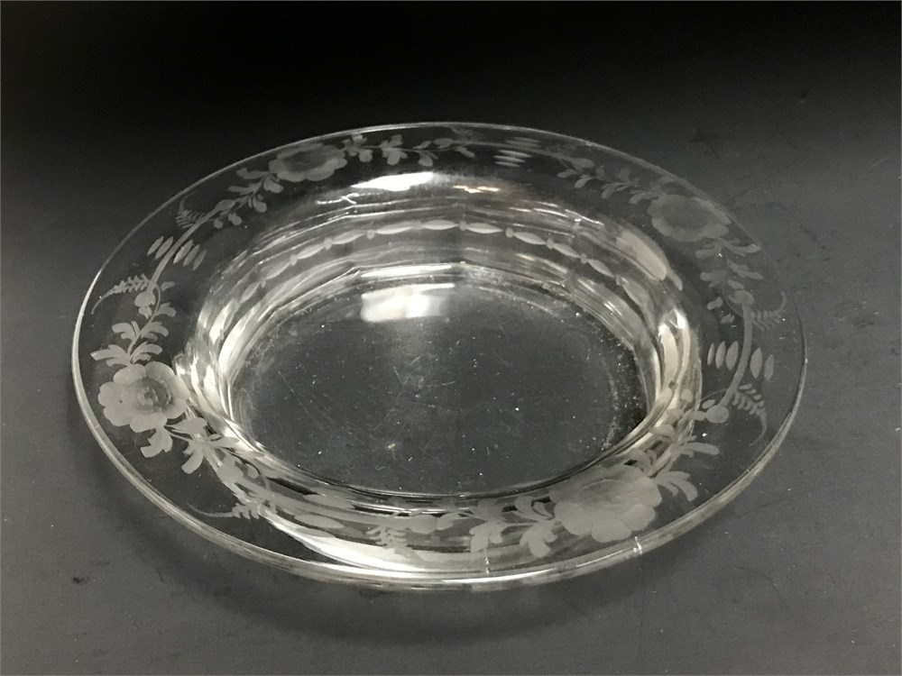 Hawkes round dish, etched with flowers, signed, very small chip on base.