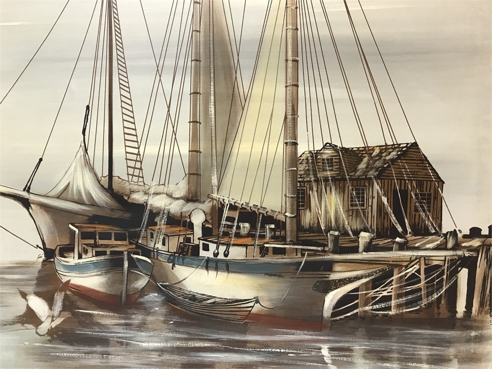 Original oil painting of ships, retro style, neat item.  Signed Collins.  36" square.