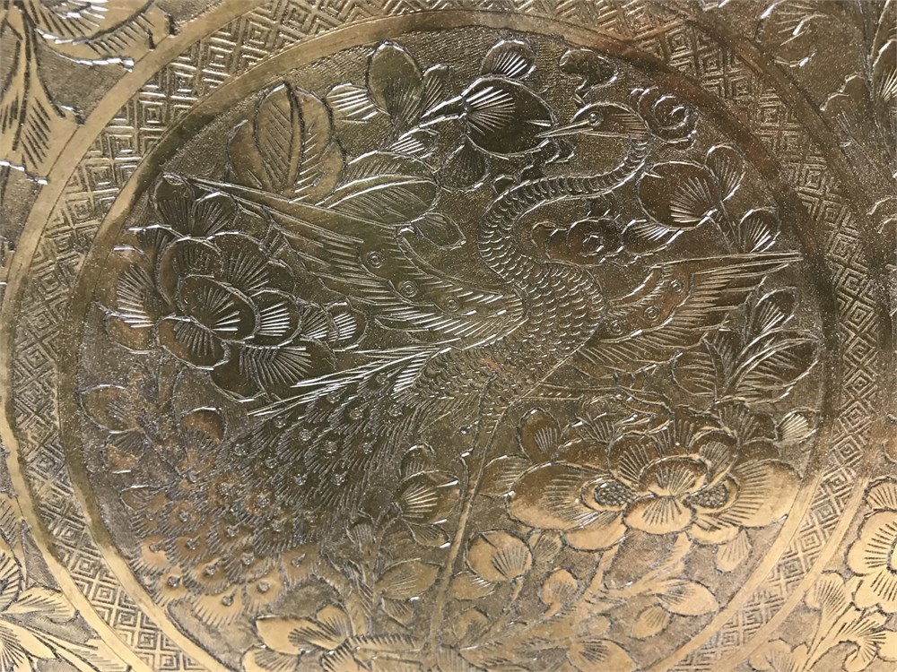Goldtone metal, possibly brass, engraved with many details including birds and animals.  Large 30" size.