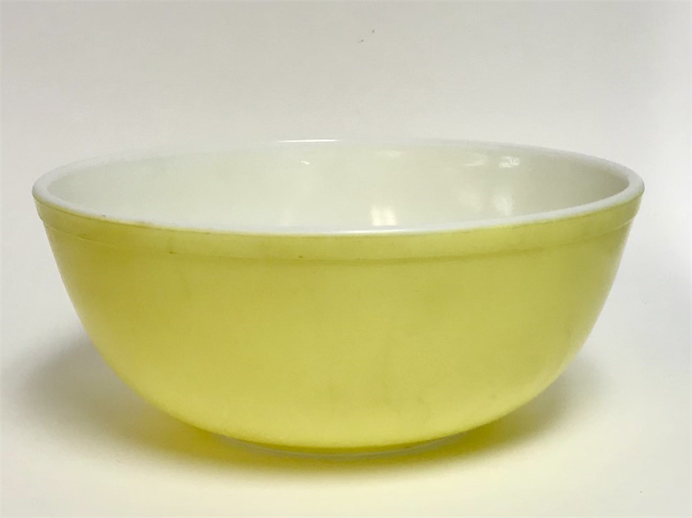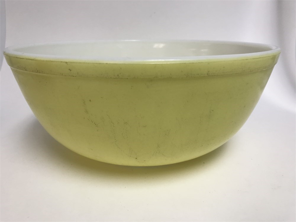 Pyrex yellow bowl, has probably seen a lot of use in the kitchen.  I think it would clean up well, no chips.  This is a large 10" bowl.