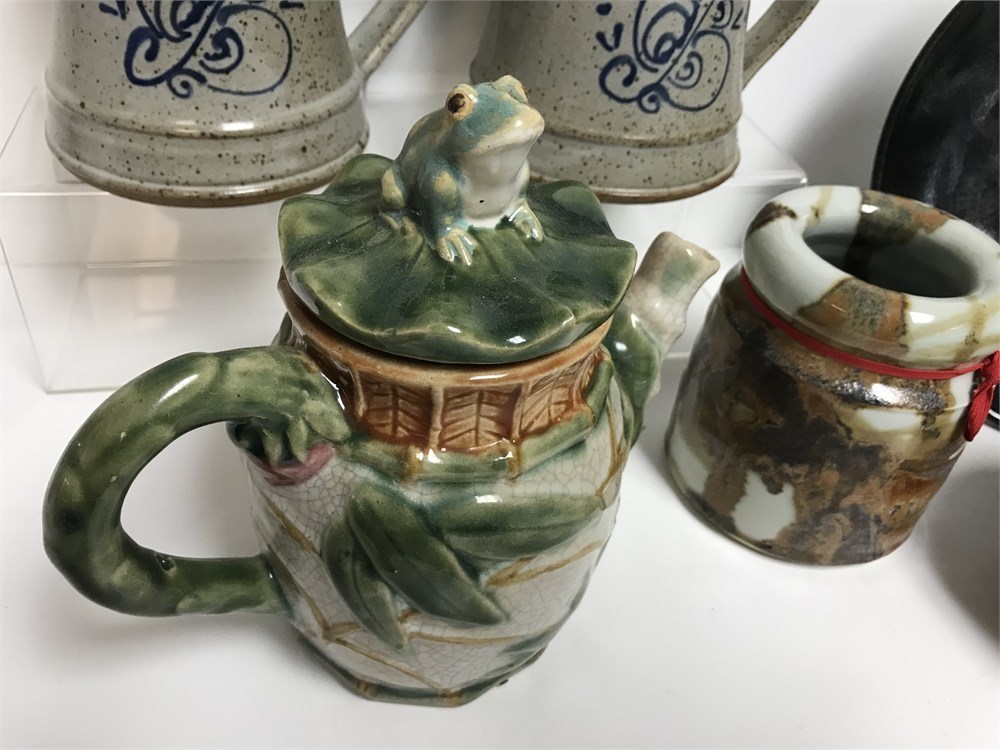 Pottery Group: Asian Majolica, Large Plate, 2 Cobalt Decorated Mugs, More