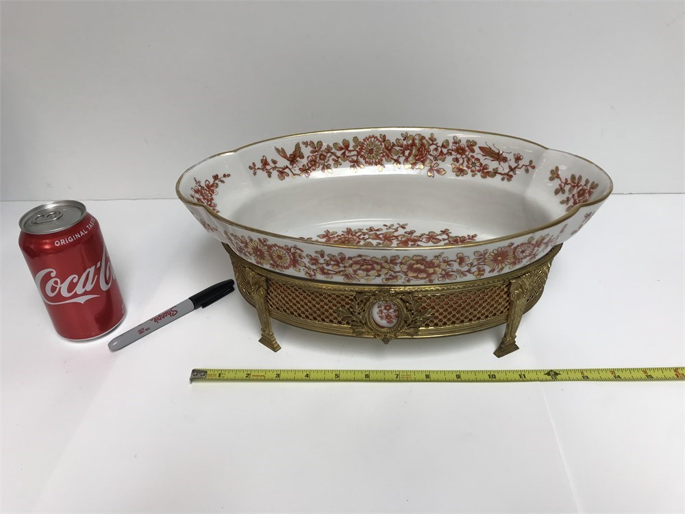Bowl is attached to metal stand.  It's a large serving bowl, 14" across.  Iron red decorations with gold trim.  A maker's mark is on the bottom, see photo.  Good condition.