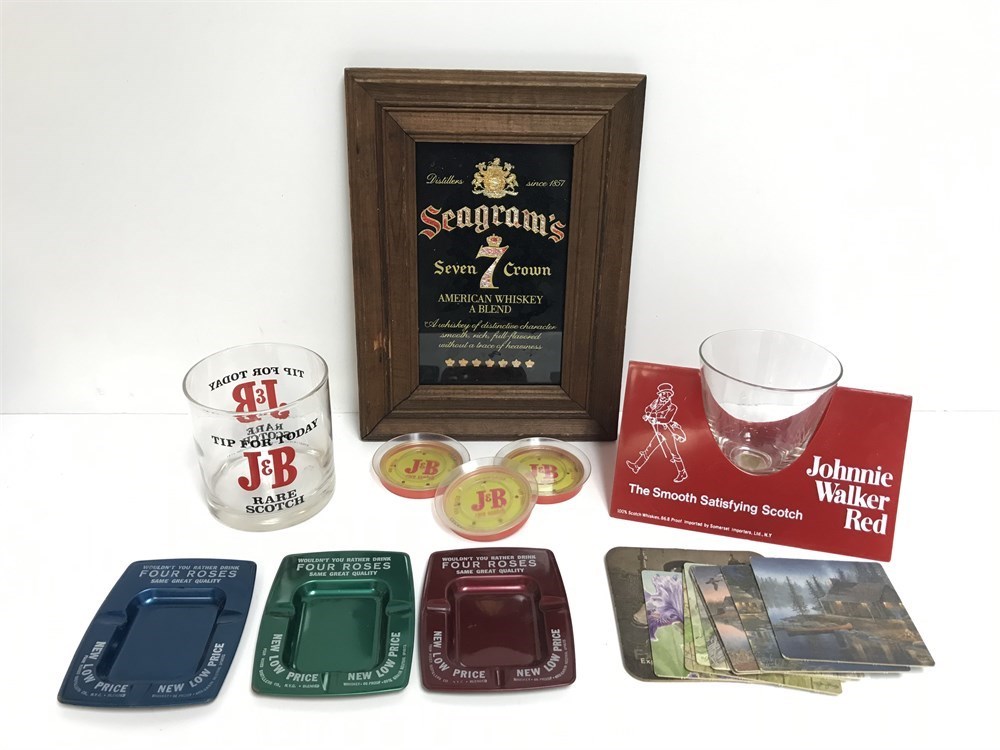 Seagram's, Johnnie Walker Red, J&B, Four Roses... Whiskey and Scotch brands.  Glasses, a wall plaque, 3 ashtrays, 3 little plastic games.  Also there are some extra unrelated coasters.