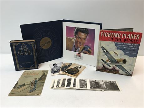 Nice collector folder with 2 Elvis stamps and attractively presented.  Books on Fighting Planes, Our Country, and Esther.  Reproduction photos, and set of photo cards.