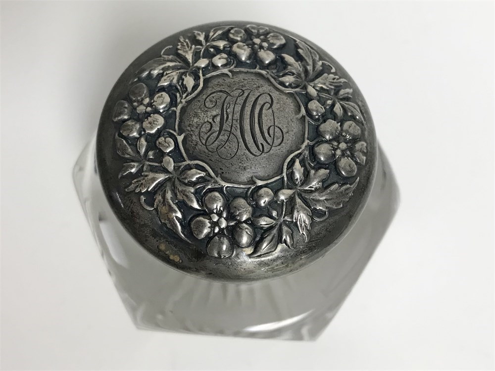 Old glass inkwell, chunky body with a pretty top that is marked Sterling.