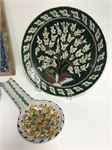 Colorful pottery items.  Countertop trivet.  Green plate, spoon rest, smaller plate.  The Gilda Mass. piece has big chips.  Everything else in pretty good shape.