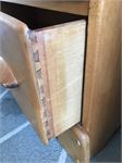 Vanity/desk and 5-drawer chest.  In the style of Heywood Wakefield but we don't see a maker's mark.  A note written on the back says it was refinished in 1965.  Both pieces for the bid!