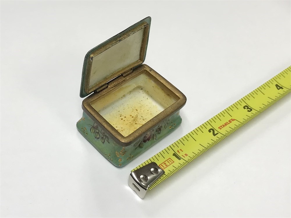 Unmarked.  We believe this is an antique English Battersea enameled snuff box or ring box.  It's very small, a tiny treasure to collect!