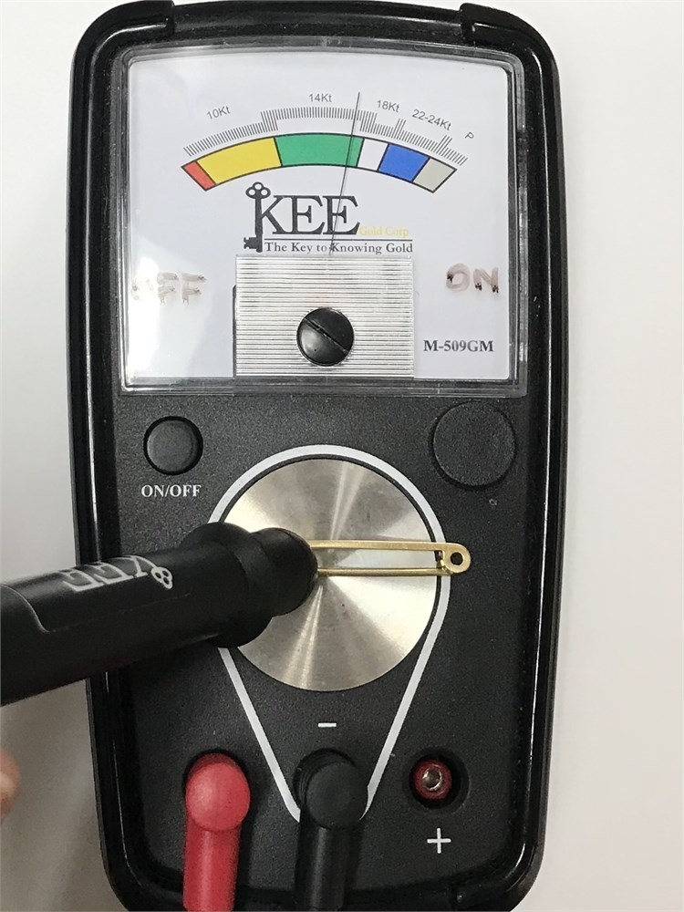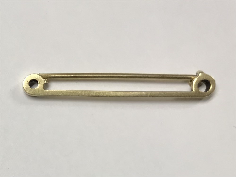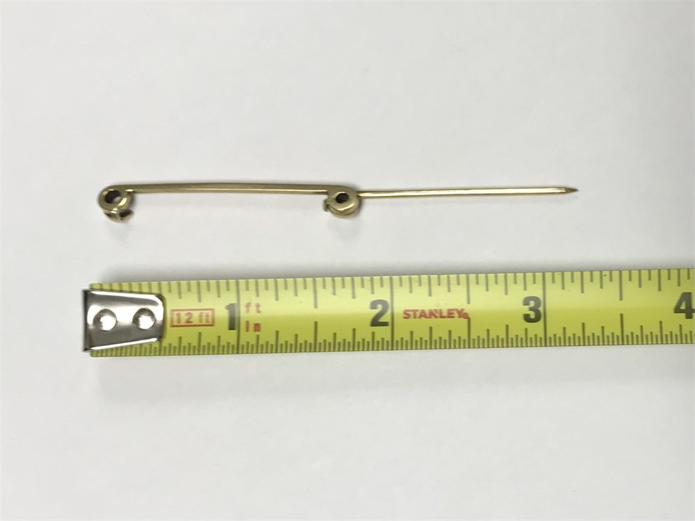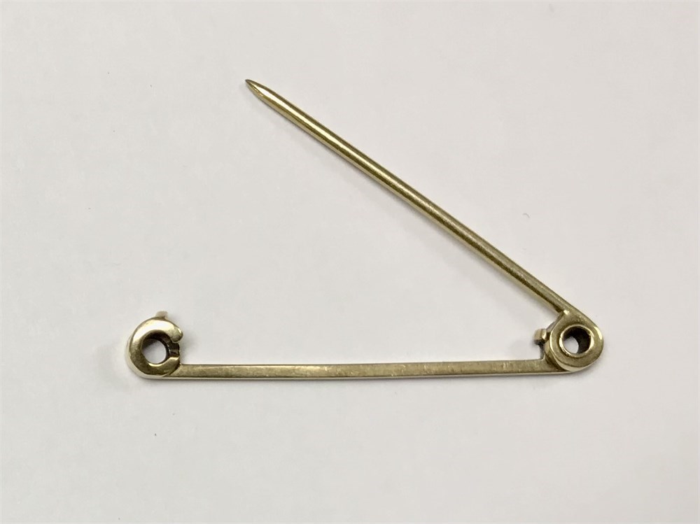 "For the person who has everything!" :)  Unmarked, tests as 14K gold.  It's a functional safety pin.