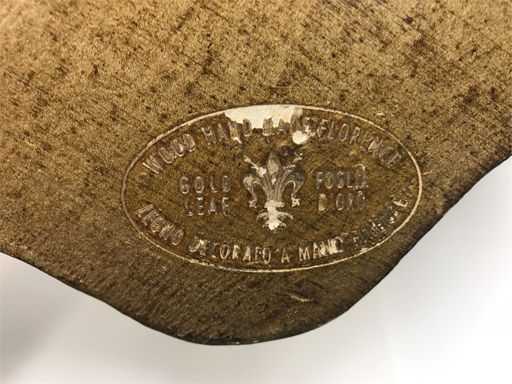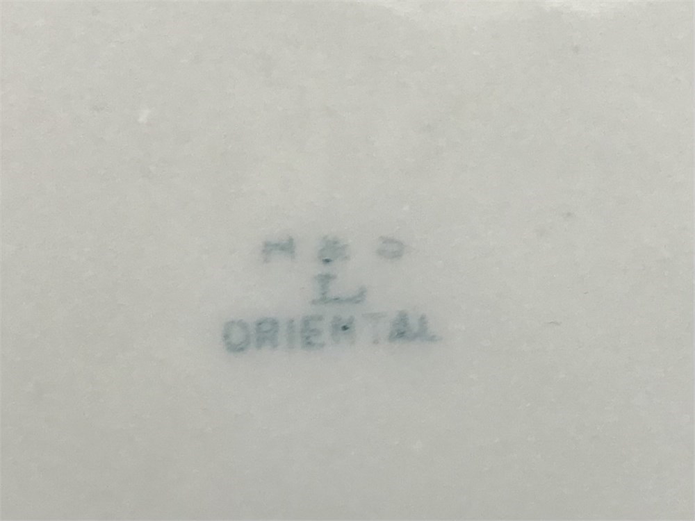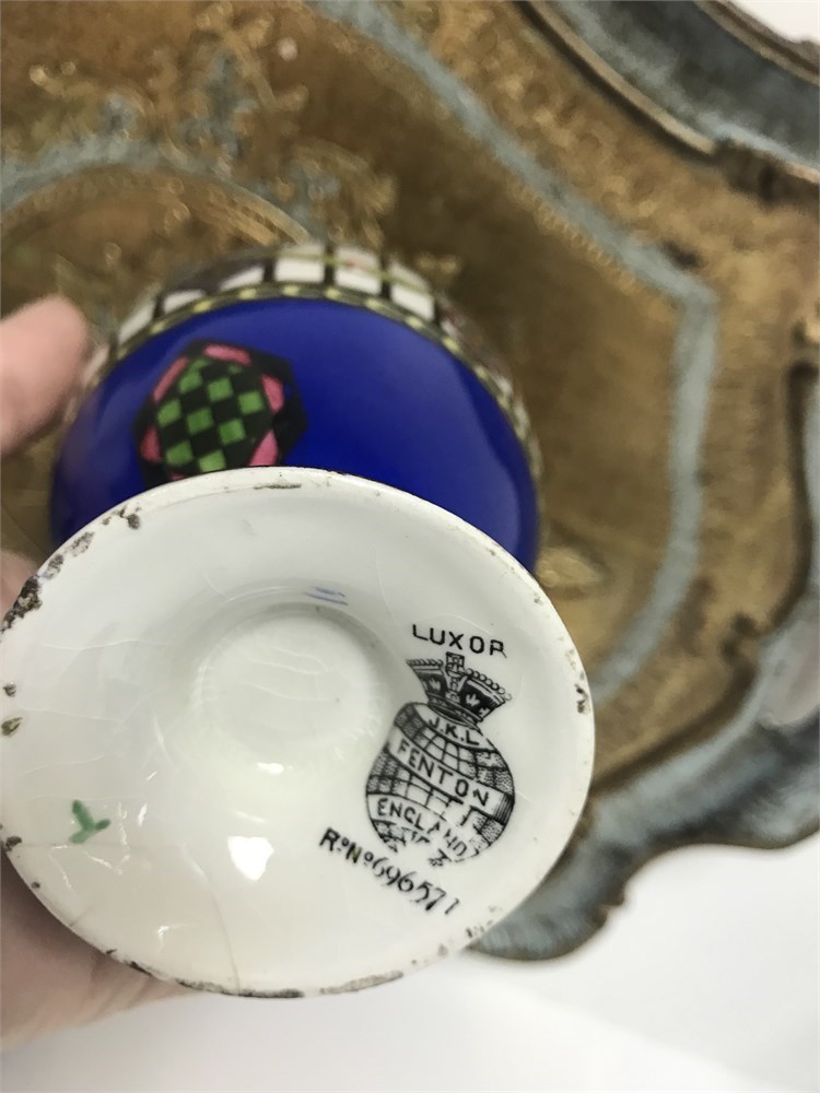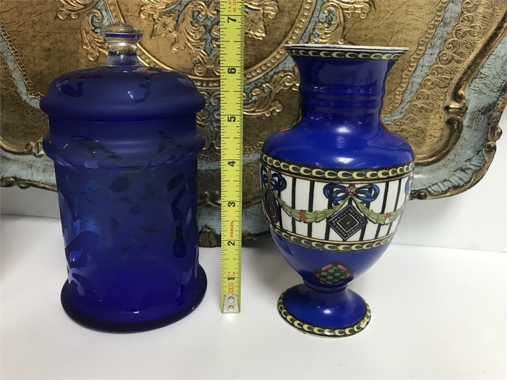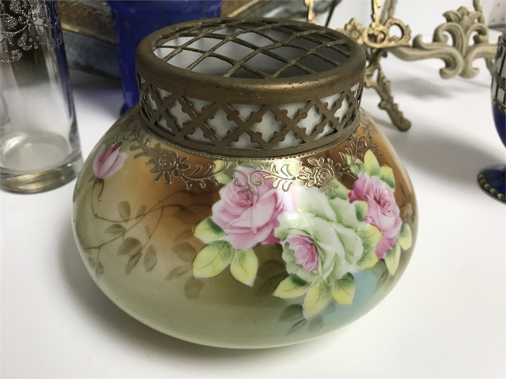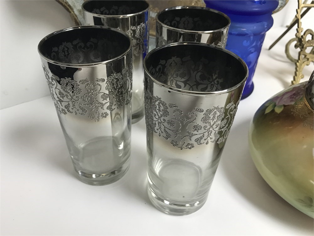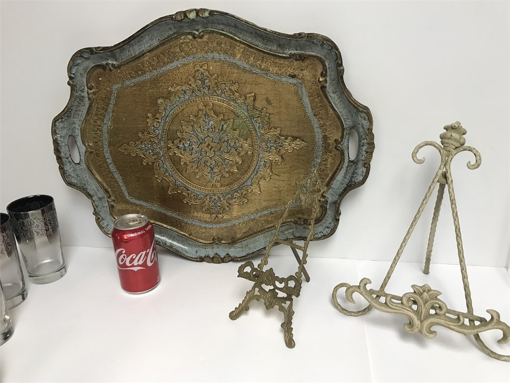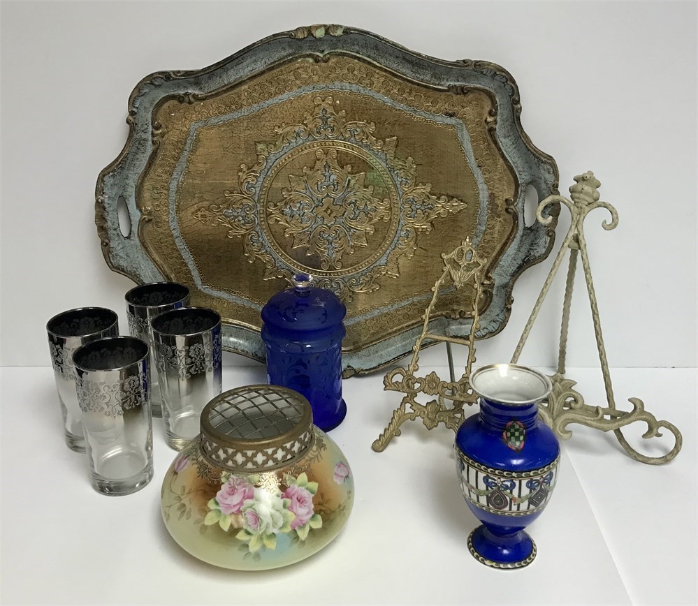 Variety lot, nice items.  4 metallic mid-century tumbler glasses.  A nice H&S "Oriental" porcelain flower vase with metal frog top.  A small antique English Fenton porcelain "Luxor" pattern vase.  2 metal display stands for art or plates.  Blue glass jar with lid.  A handmade Italian wood tray, gold leaf.