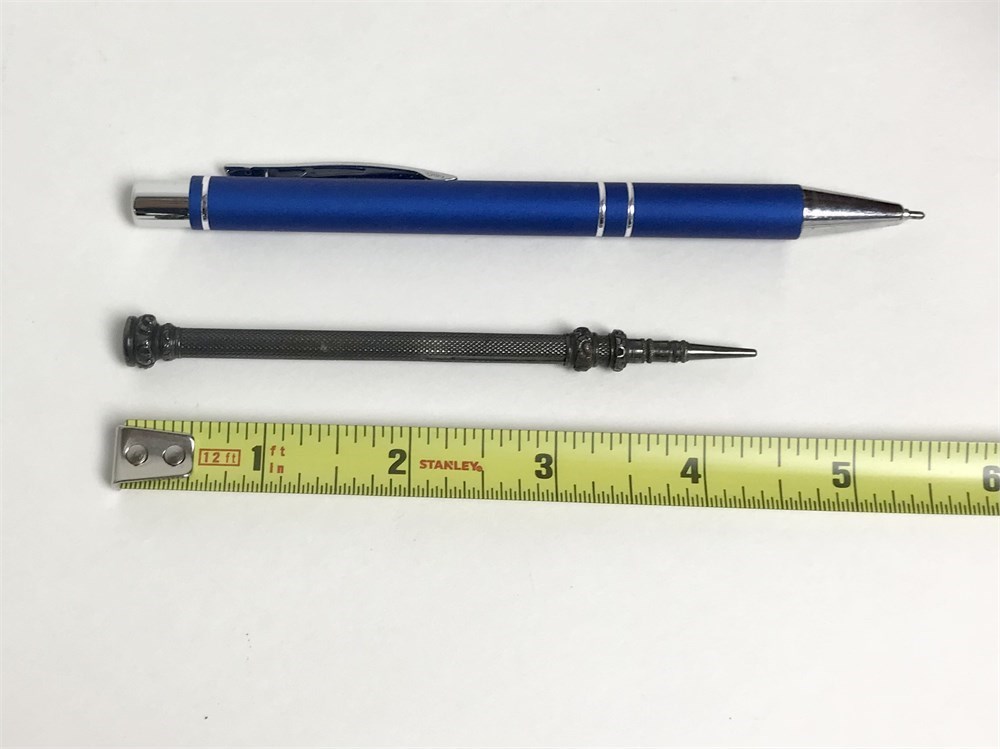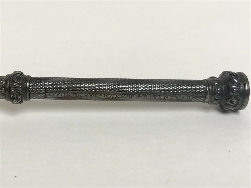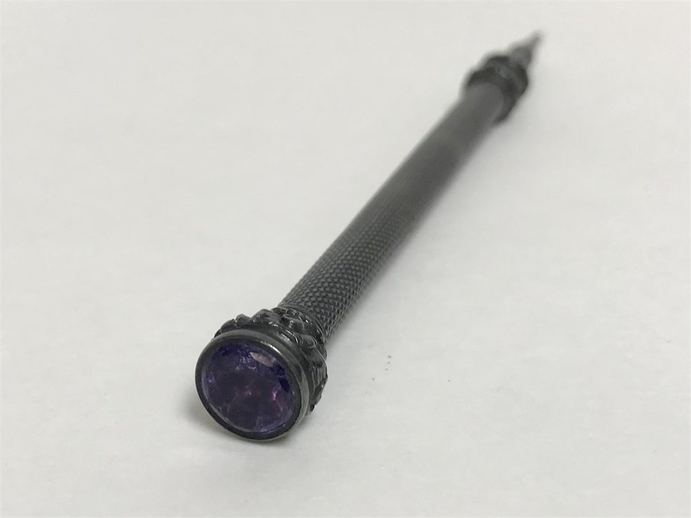 Very pretty antique mechanical pencil, and the slide mechanism works.  It's likely sterling silver.  It's marked: S. Mordan & Co. Makers & Patentees, and also has the letter H near the tip.  Amethyst colored "gem" top.