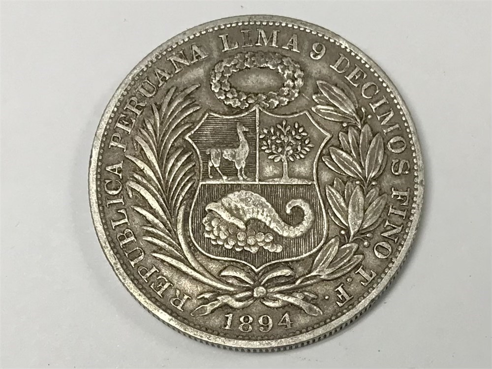 1894 Peru coin, 1 sol.  Weight is 24.7 grams; these coins are 90% silver.