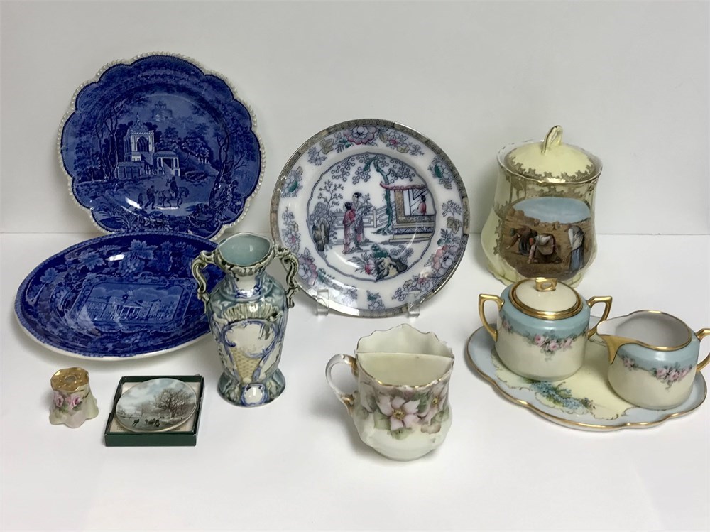 Porcelain Group: Flow Blue Plates, Antique Vase, More