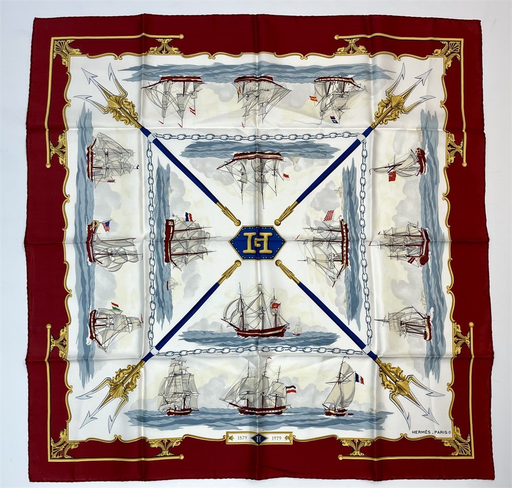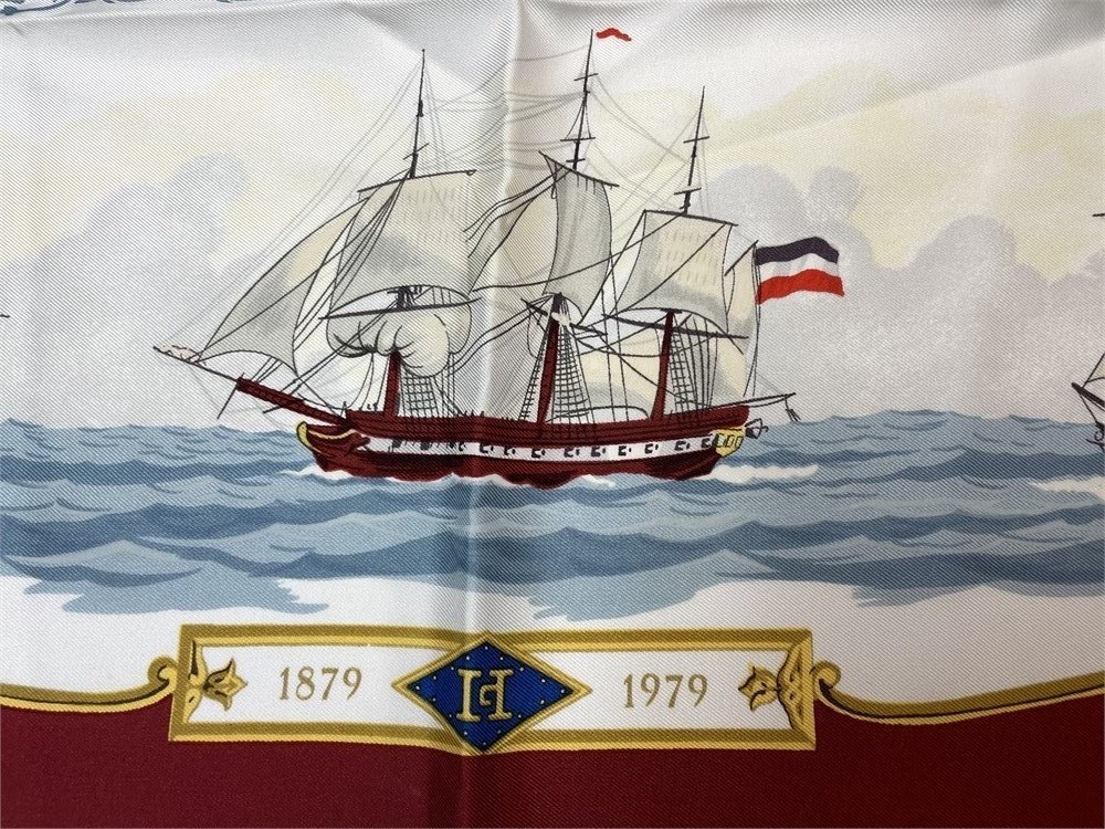 "La Marine en Bois" by artist Hugo Grygkar, by Hermes, Paris.  Condition looks really nice and there are no flaws to point out.  Hand rolled hem.  The scarf is pure silk, and a small tag says "100% soie."