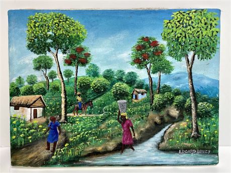 Small original oil painting by Haitian artist Edgard Bouzy (b. 1955), signed in lower right, dated 2011.  Unframed.  This great piece has a lot of character, with vibrant colors in a scene of daily activities in the mountain village.