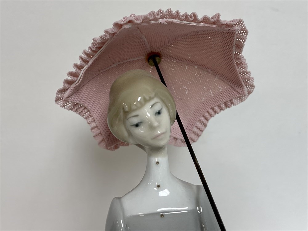 "Dressmaker" by Lladro, a porcelain figure of a lady with lacy parasol, hand made in Spain.  I'm happy to report that it is in good condition with no damage, which is a rather rare circumstance for figures with this fragile porcelain lace.  She's a beauty!  About 14.5" tall.