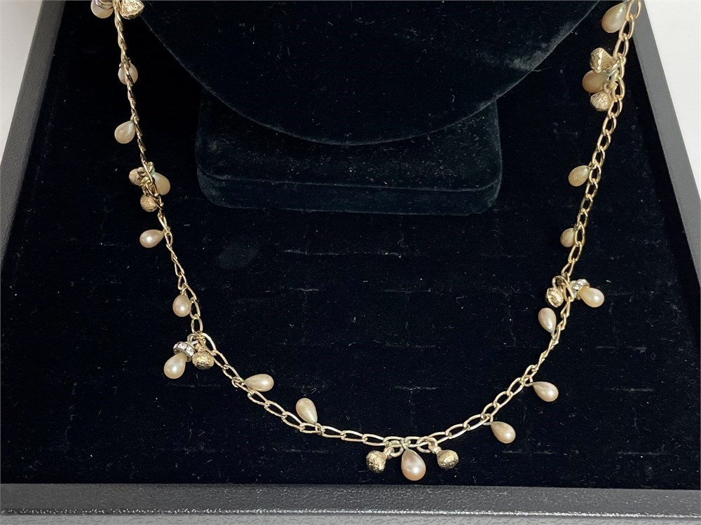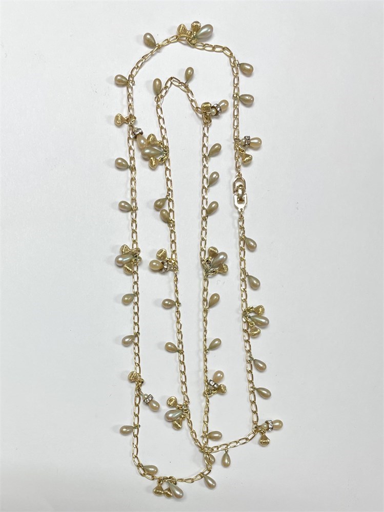 A long 35" goldtone necklace signed "Chr. Dior" on the clasp.  Also marked "Germany" and "Metal" on the clasp.  It's likely from the 1970's-80's.  Please see photos for condition details; the simulated pearls are showing some age, while the gold color is still bright.  There are a few crystal accents too.