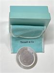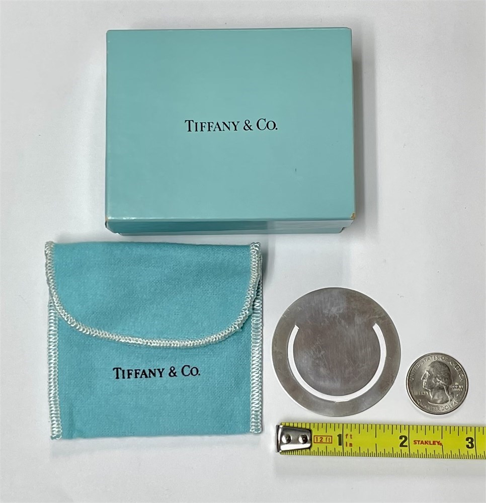 Tiffany & Co. sterling silver round bookmark.  No monogram, and it still has the original bag and box as you can see.  Marked 925/sterling.