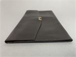 A rare Chanel purse which was likely a promotional item for VIP customers in the 1970's-80's.  It's a large dark brown flap wallet, or could be used as a simple evening clutch bag.  There are four compartments, it's lined with moire fabric, and looks clean inside.  The Chanel logo is gold stamped inside, and it has a Flox snap closure.  Condition is generally good, given its age, with no particular issues or flaws to mention.  9.5" x 5".