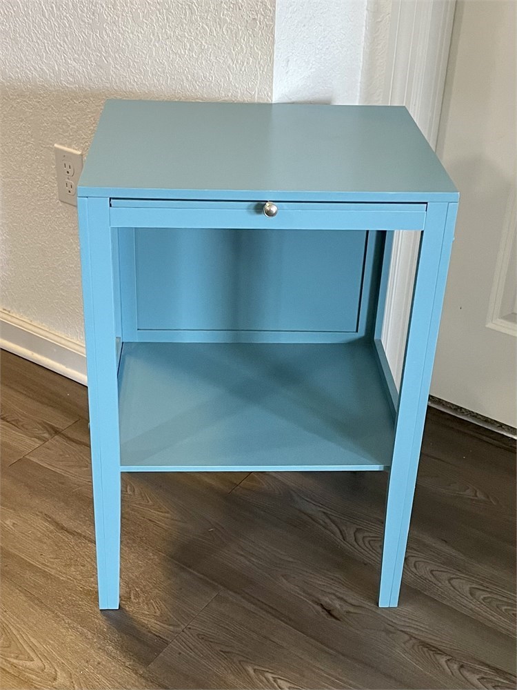 Modern, good condition, basically like new, few if any scratches.  There is a pull-out shelf with knob.  Small size for a bedside etc.