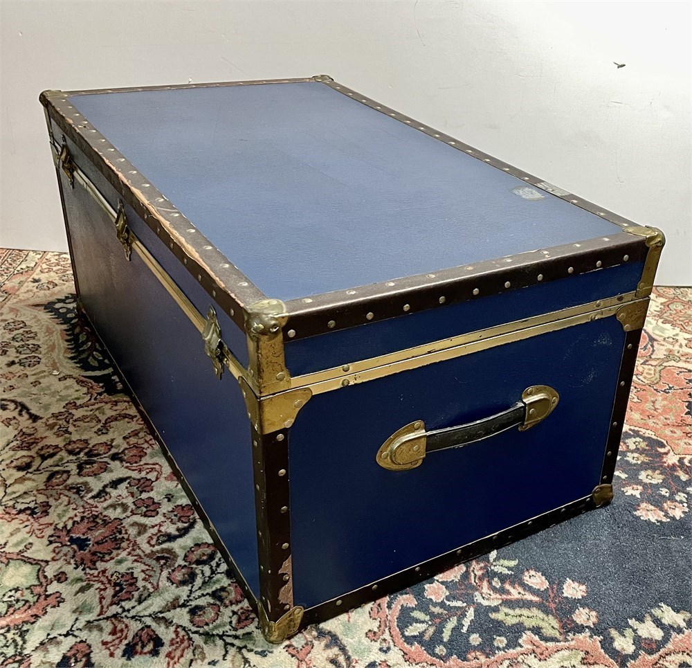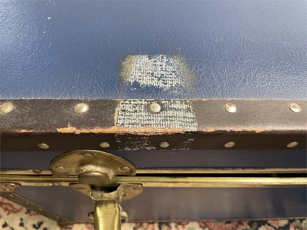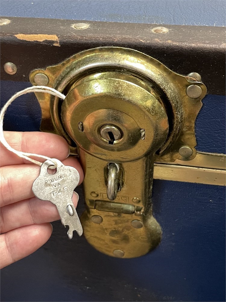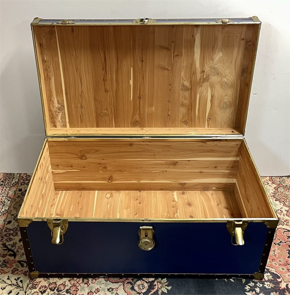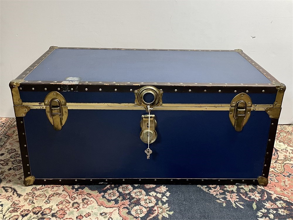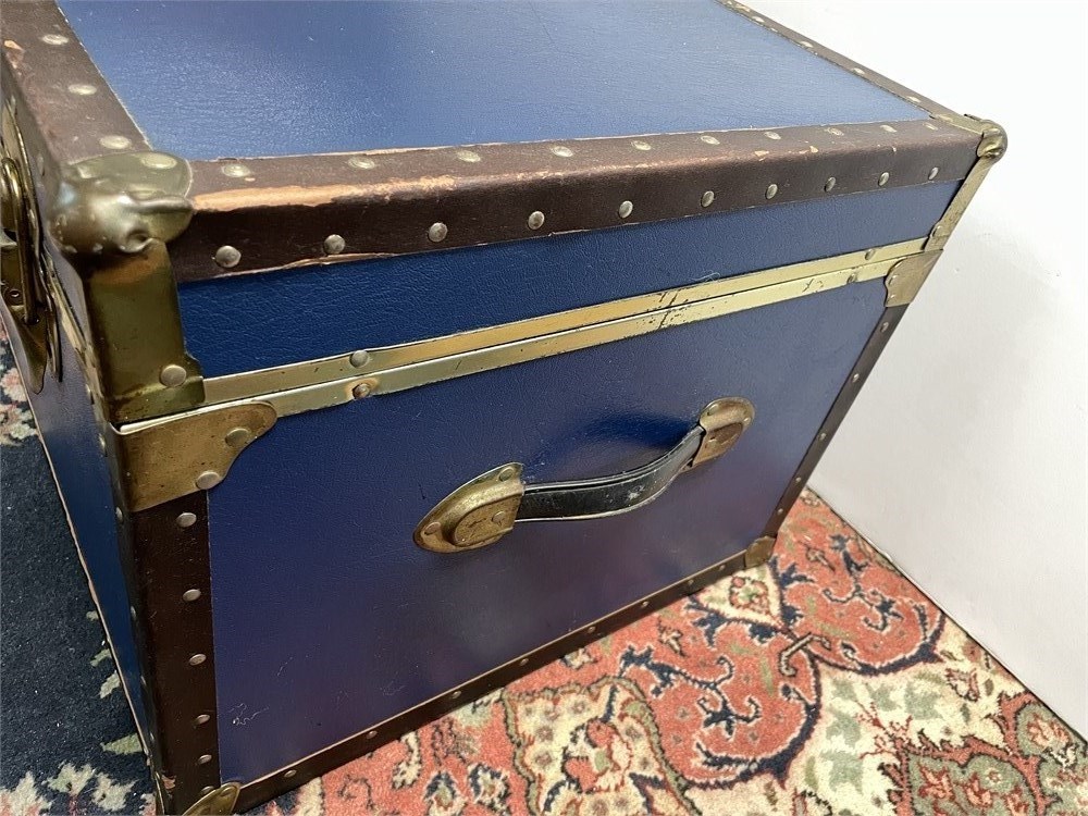 Nice looking lightweight footlocker trunk, navy blue color.  It's fragrant when you open it - cedar lined!  There is a spot of duct tape residue on top, and the edges are worn.  Still, condition is pretty good for its age.  Both handles present.  It locks and the key is included.