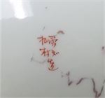 9 plates with paintings of flowers, branches, and birds.  Bright pink rims; they're attractive.  Signed on base, see photos.