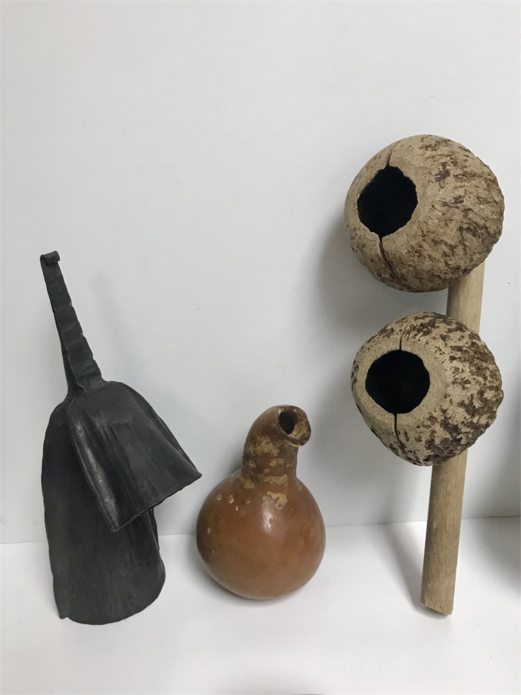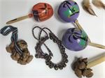 Mostly African items, in fact the metal double bell has a sticker that says Made in Ghana.  There are seed pod shakers, painted maracas, bells, a small wooden percussion frog, more.