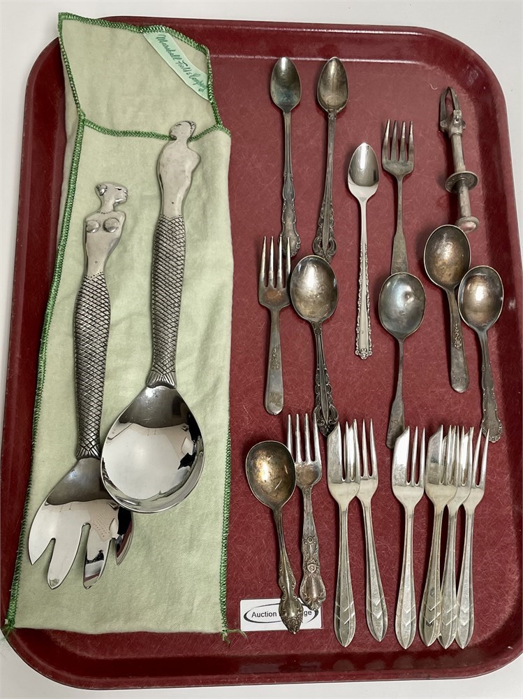 Artistic figural salad serving pair, signed C. Boyes, S. Africa.  And a few small silverplated utensils from the estate's buffet: child size forks and spoons, and cocktail forks, etc.