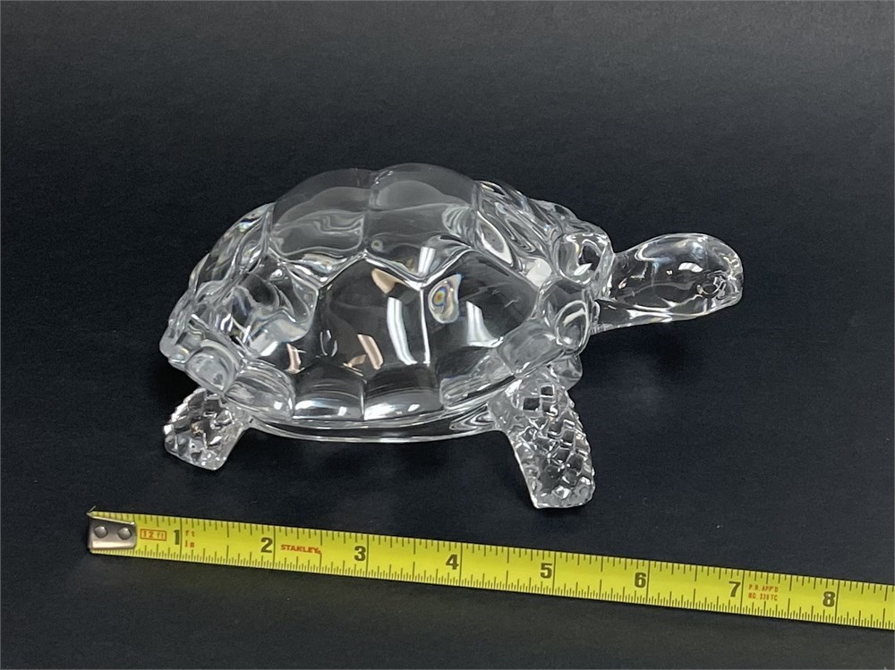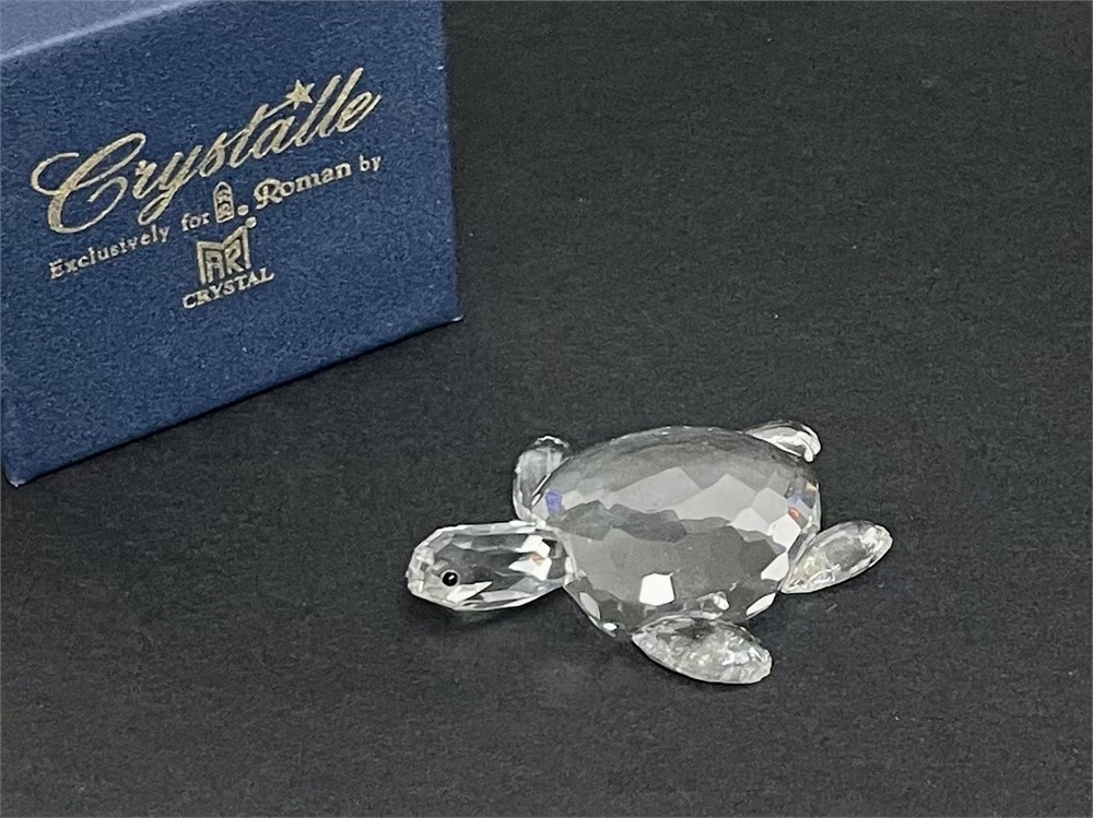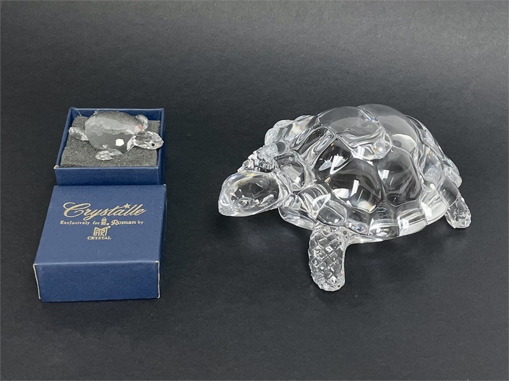 A small "Crystalle by Roman" crystal turtle (looks similar to Swarovski), with box.  And a larger glass turtle, unsigned.  Both in good condition.
