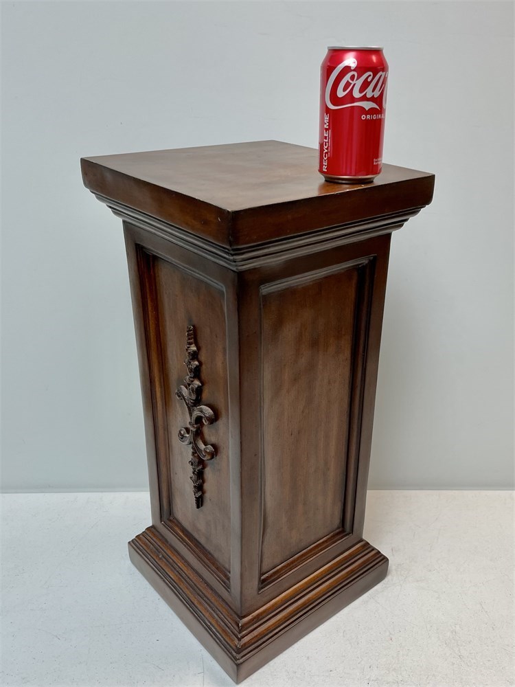 This pedestal looks like wood, but it is fiberglass.  It's sized to hold a plant or other showpiece in your home.  24" tall.