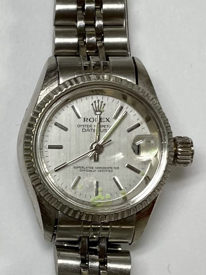 Watch is running, and is not a genuine Rolex watch.  Notice how the little green dots fell off of their positions.  They are supposed to glow in the dark.