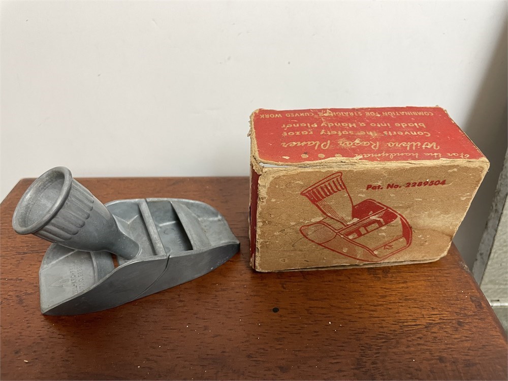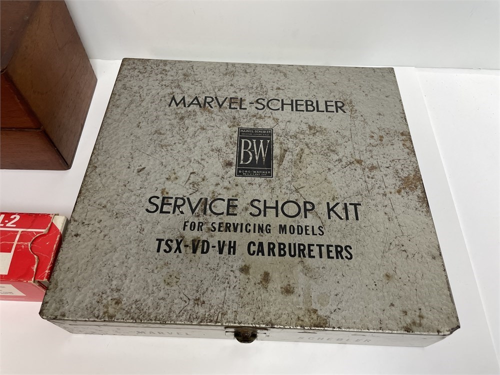 Workshop items.  Metal box (a Marvel-Schebler automotive service kit) that is filled with screws.  Wood level.  Realistic vintage microphone in good shape.  Two-drawer wood organizer box.  And a little wood planer that uses razor blades.