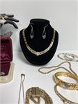 Mostly modern jewelry, although there are a few vintage pieces here too.  Necklaces, bracelets, rings, earrings, pins.  Avon, Swarovski, White House Black Market, Joan Rivers, others.  Most are in good condition, but I did notice missing stones or flaws on a few pieces.  Also there is a neat old Fifth Avenue Bulova box (no watch for it though).