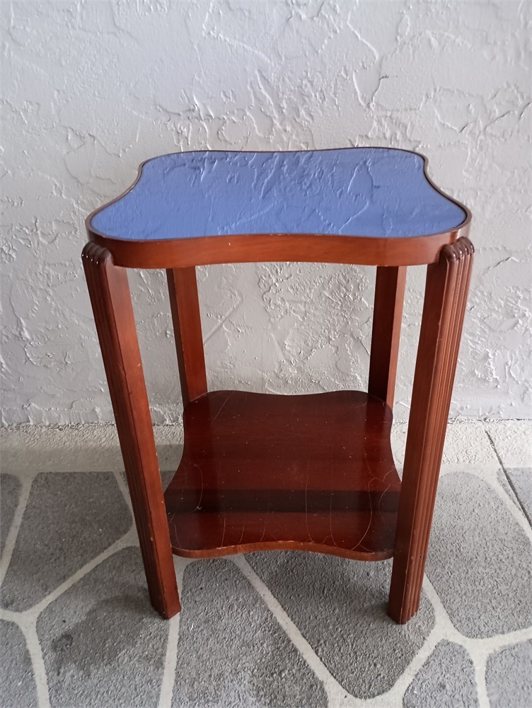 Funky blue mirror on top.  Looks good!  The mirror top has spots and scratches like you would expect for age mostly around the edges.  It's hard to see in the photos (dark spots).  Come check it out or take a chance.