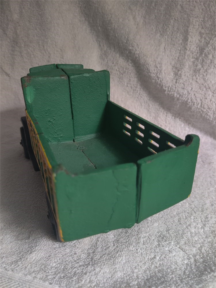 Nice cast iron toy stake truck. Truck has great color. Measures approximately 11 in long 5 in tall and about 5 in wide.