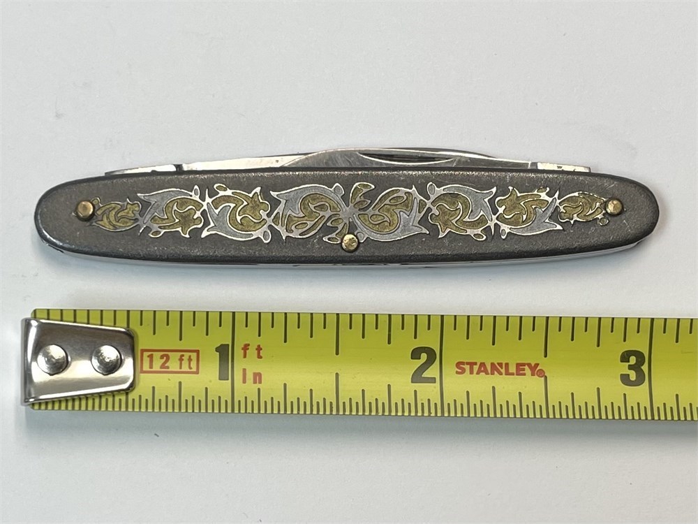 Folding two-blade pocket knife with decorative metal exterior.  Marked: Frank Buster Cut Co., Germany, Solingen; and it has a "Fight'n Rooster" blade.  Nice item.