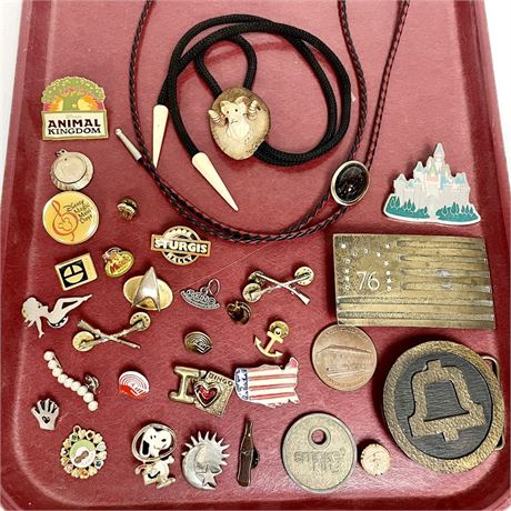 A nice carved ivory ram's head bolo tie, and another bolo tie.  1976 belt buckle and Bell System buckle.  Various small pins including some Disney, also Sturgis, Snoopy, Mack, Star Trek, Jimmy Carter, various others; and a couple medallions in there too.