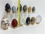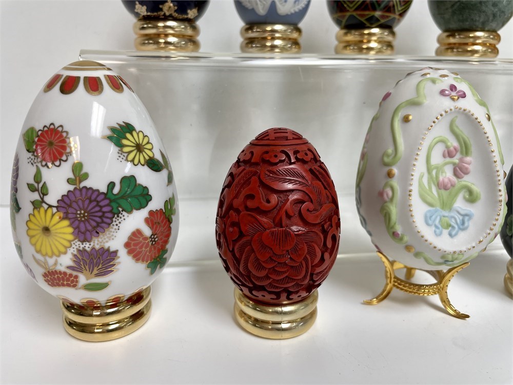 The complete collection of 12, issued by Franklin Mint, intended to showcase the worldwide variety of collectible eggs.  Crystal, filigree, cloisonne, cinnabar style, pewter, marble, Wedgwood style, more.  Each egg has its own stand.  Good condition, and they're all lovely.