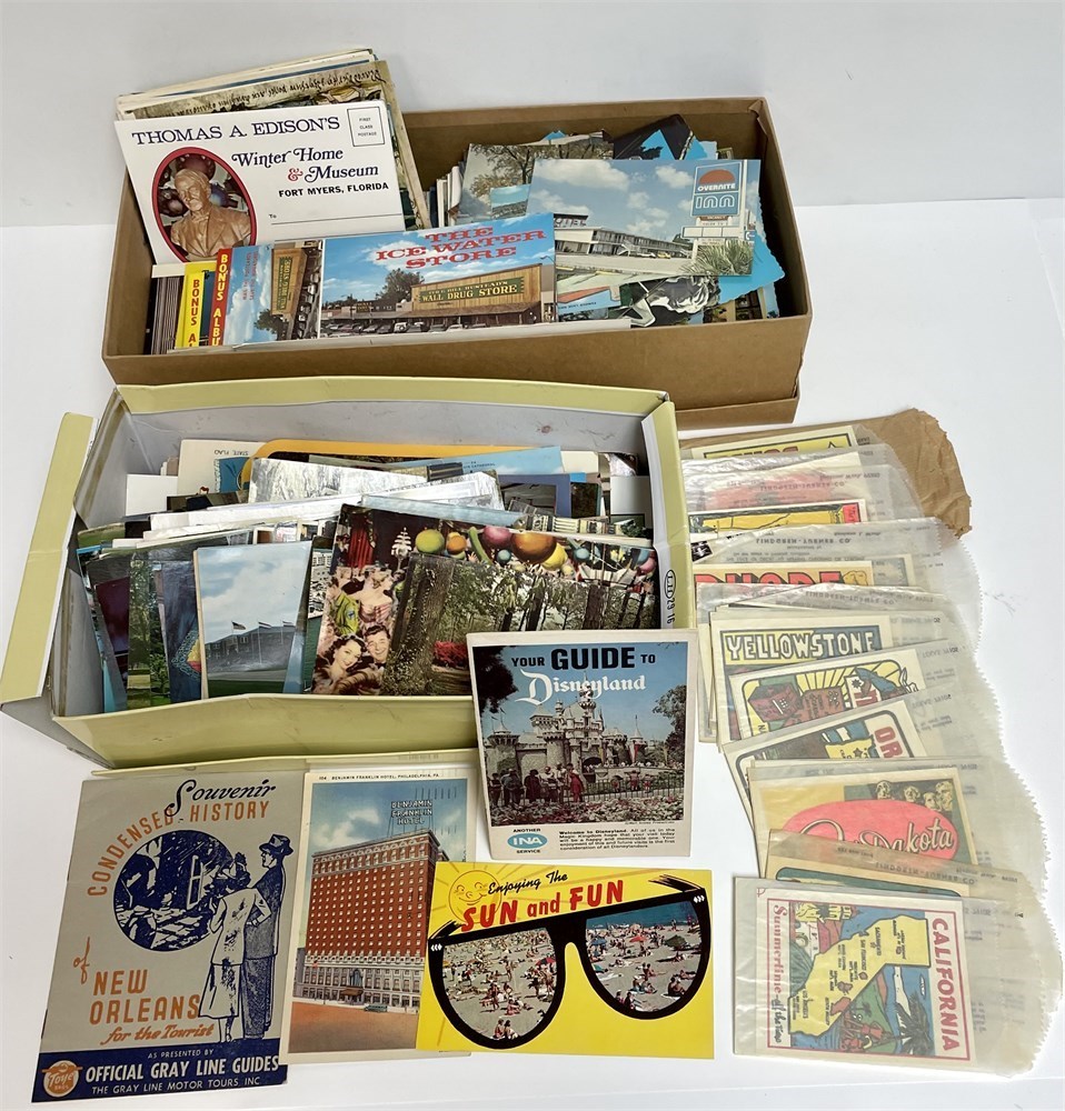 Mostly postcards, and most are mid-century era.  Many travel scenes, US tourist spots, etc.  Some are large sized.  Also in the group is a neat packet of old luggage decals.