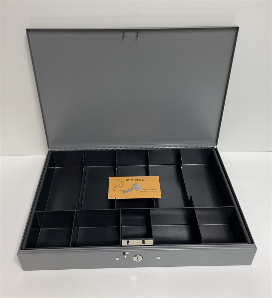 Metal box.  Useful and in good condition, seems like new.  2 keys.