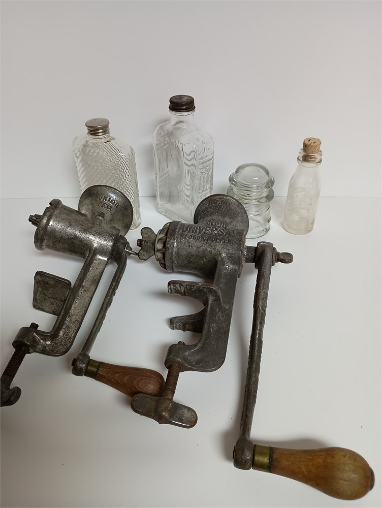 Universal food grinder and a Junior Grinder, along with a group of small bottles and one old glass insulator.  The flask is Universal, and one of the bottles is for Edison battery oil.